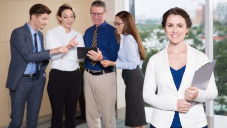 Portrait of happy young female executive manager standing in office, holding clipboard, smiling at camera. Her business team discussing project on tablet computer in background. Leadership concept